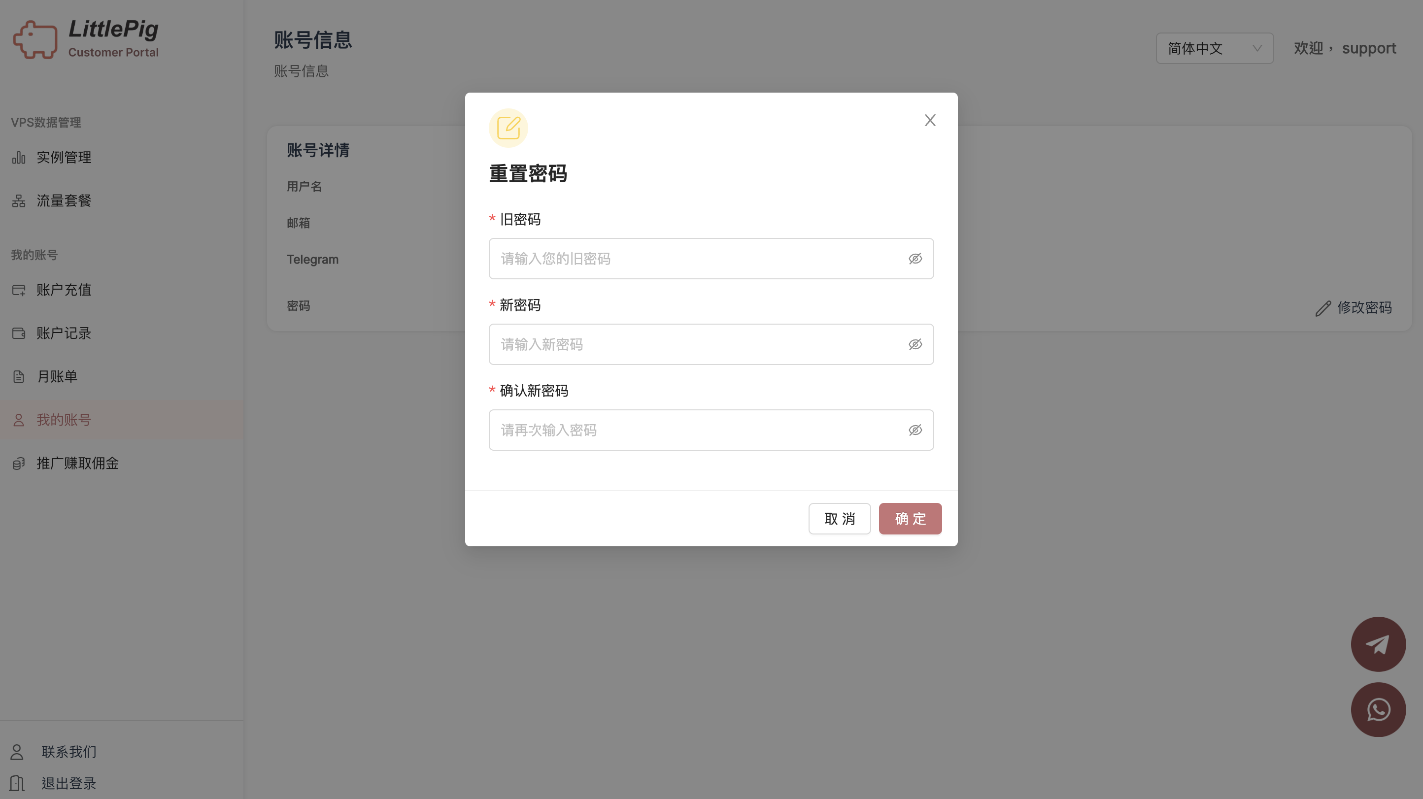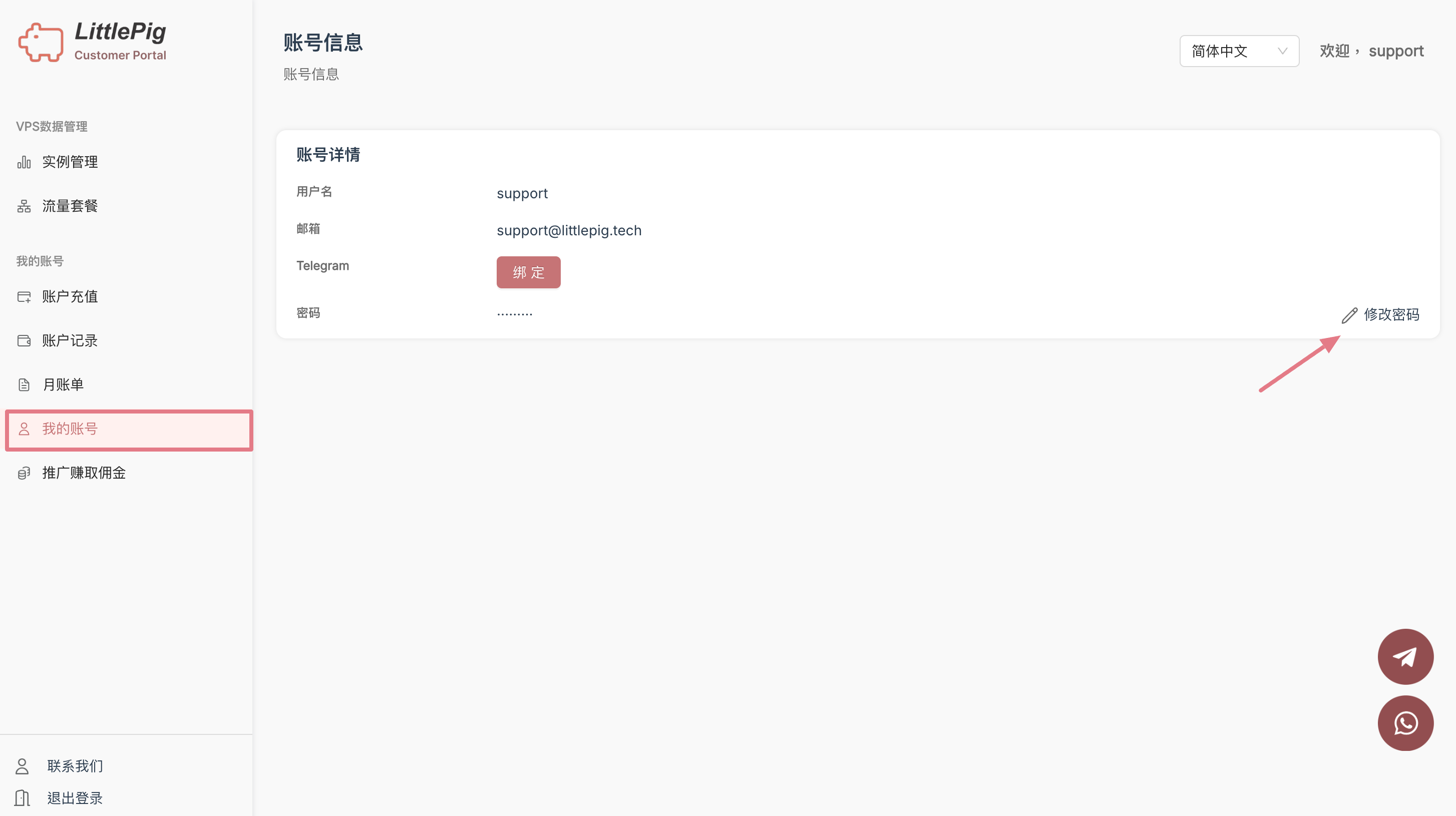 使用您的信箱和密碼[登入帳戶](https://vps.littlepig.tech/login)。進入側邊欄中的“我的帳號”，然後點擊“更改密碼”。