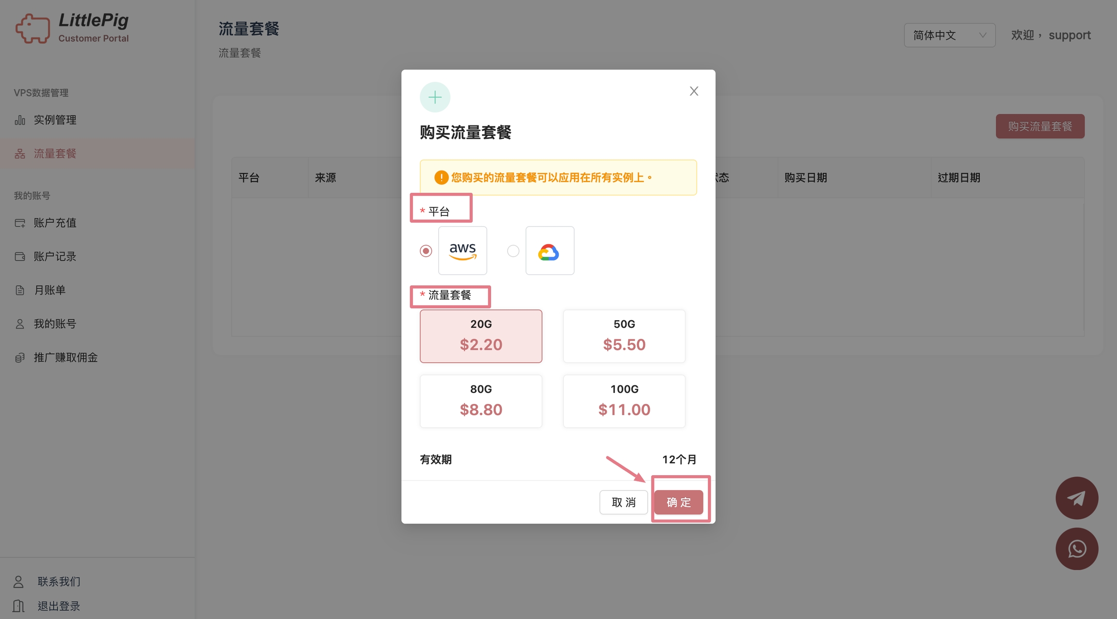 選擇合適的平台與流量套餐,然後點擊“確定”。