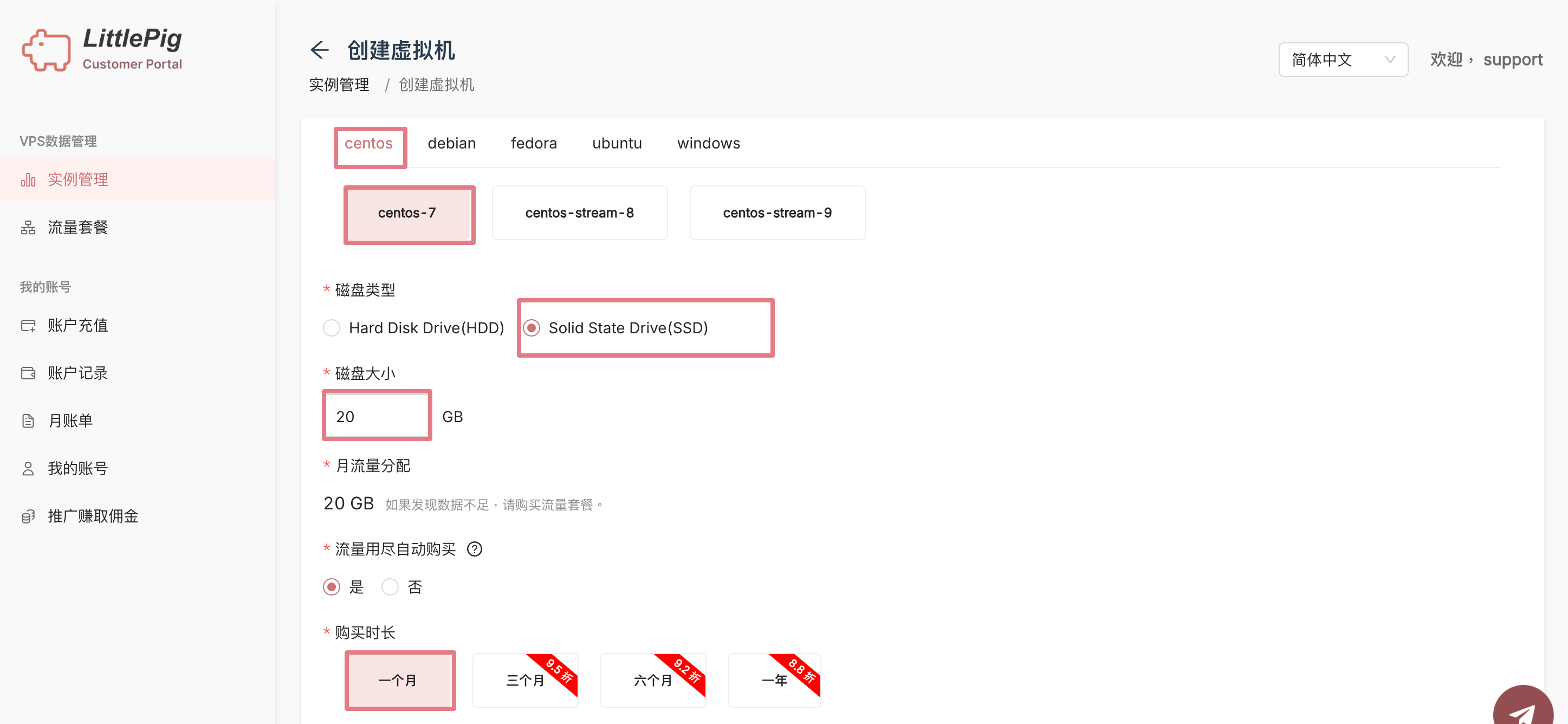 選擇作業系統、磁碟大小和購買時長。<br>